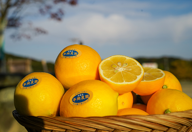 淡路島の自然の恵みで育った、平岡農園自慢のレモン。まろやかで酸味が強く香り豊かなアレンユーレカレモンと、圧倒的な果汁量が魅力のマイヤーレモン。